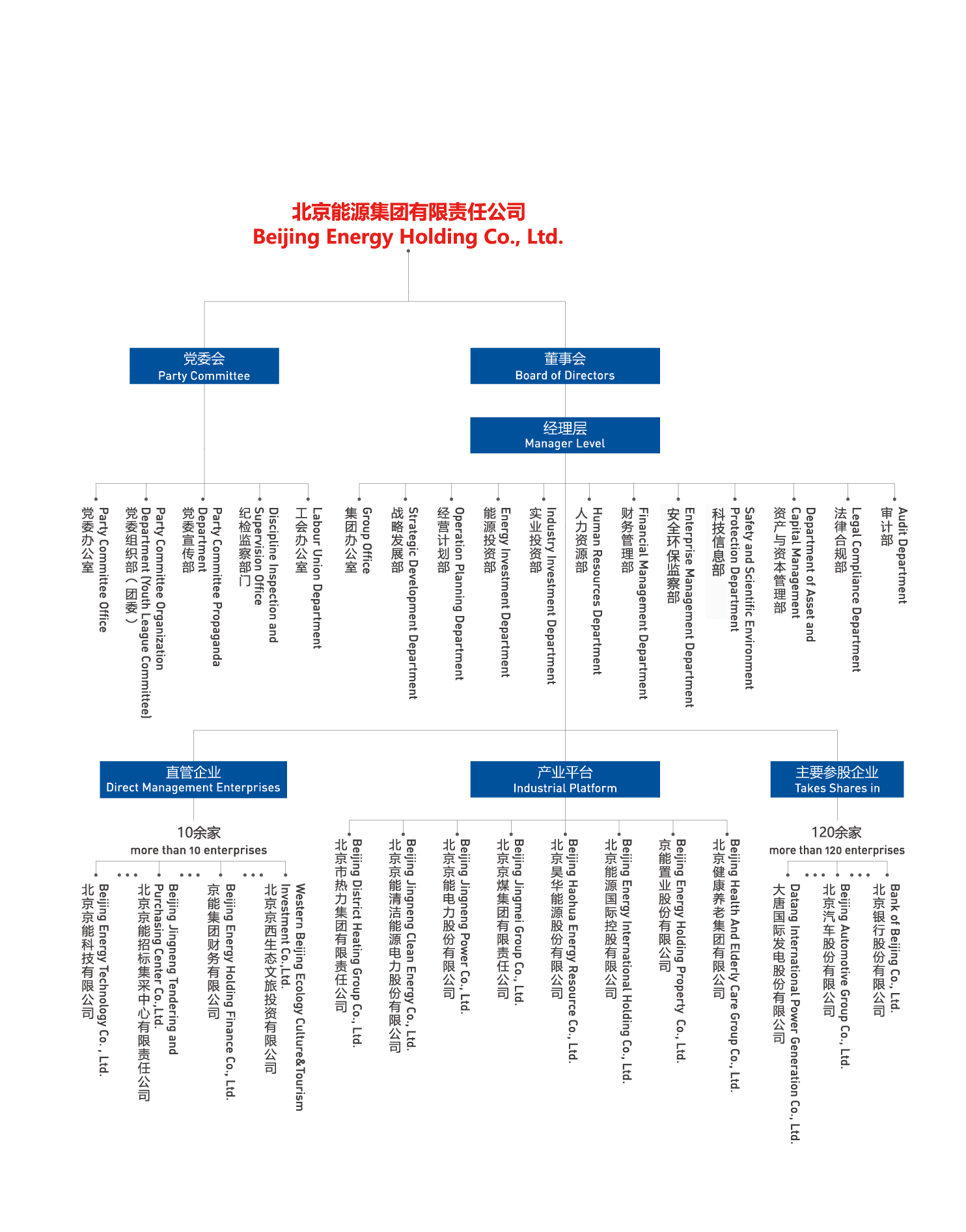 北京能源集團(tuán)有限責(zé)任公司(以下簡(jiǎn)稱“京能集團(tuán)”或“集團(tuán)”)是北京市人民政府出資設(shè)立的國(guó)有獨(dú)資公司,肩負(fù)著保障首都北京能源安全可靠供應(yīng)的重任。集團(tuán)成立于2004年,由原北京國(guó)際電力開發(fā)投資公司和原北京市綜合投資公司合并而成,2011年、2014年先后又與北京市熱力集團(tuán)有限責(zé)任公司、北京京煤集團(tuán)有限責(zé)任公司實(shí)施合并重組,實(shí)現(xiàn)了產(chǎn)業(yè)鏈條融合互補(bǔ)。經(jīng)過多年的資源整合,集團(tuán)由單一能源產(chǎn)業(yè)發(fā)展為熱力、電力、煤炭、健康文旅等多業(yè)態(tài)產(chǎn)業(yè)格局。2024年底,集團(tuán)資產(chǎn)規(guī)模達(dá)4934億元,年?duì)I業(yè)收入975億元,全資及控股企業(yè)860余家,參股企業(yè)120余家,擁有員工3.4萬余人,投資區(qū)域遍布全國(guó)33個(gè)省市區(qū)以及海外,控股京能清潔能源、京能電力、昊華能源、京能置業(yè)、北京能源國(guó)際、京能熱力六家上市公司,盈利水平長(zhǎng)期穩(wěn)居北京市屬企業(yè)前列。2024年在中國(guó)企業(yè)500強(qiáng)排名第247位,中國(guó)服務(wù)企業(yè)500強(qiáng)排名第87位。